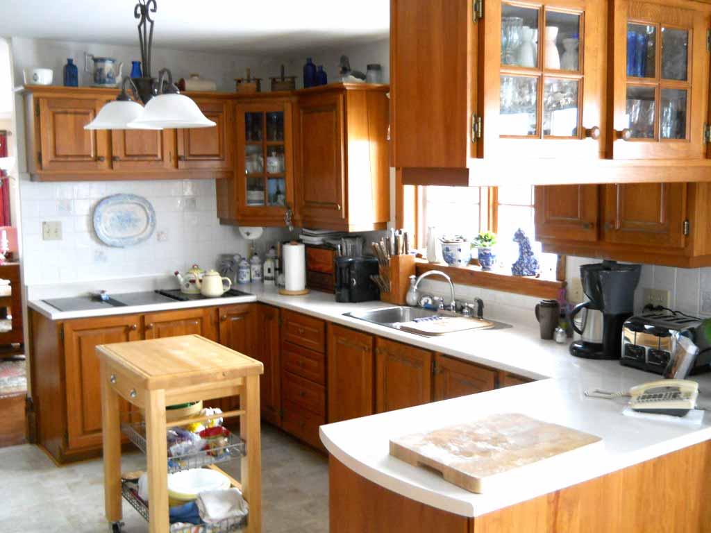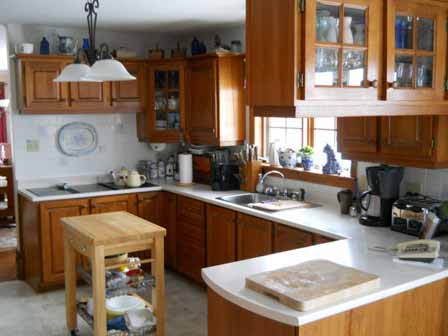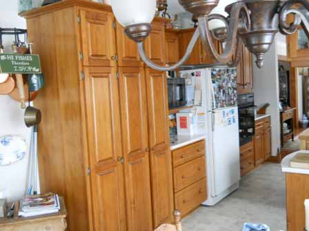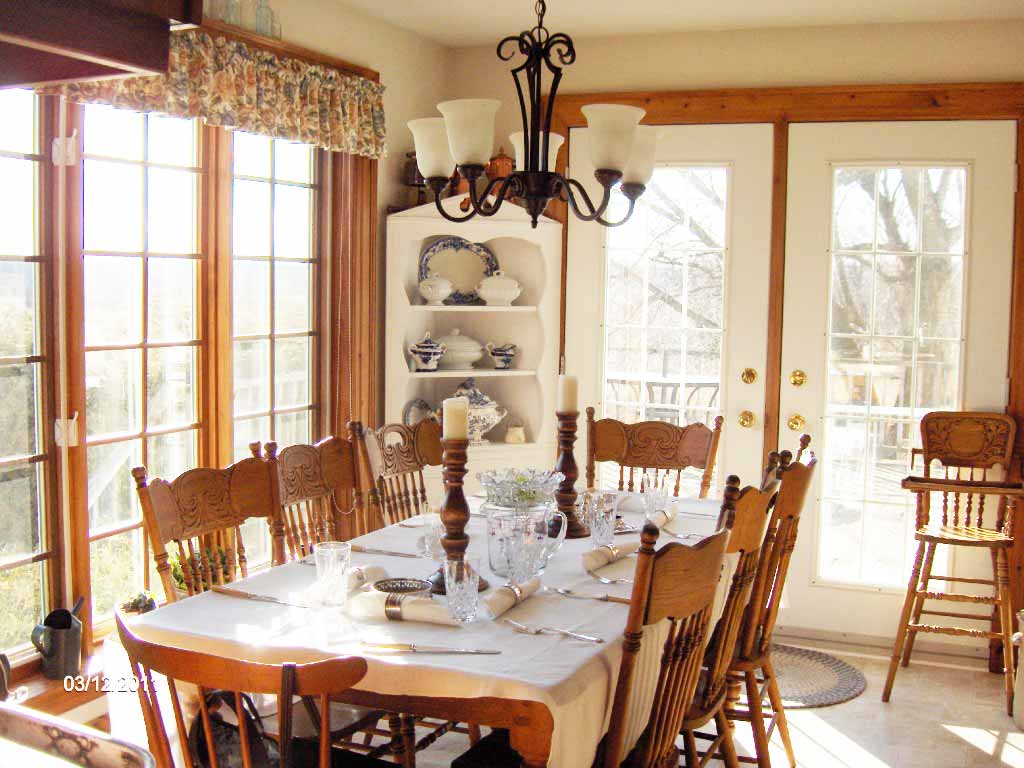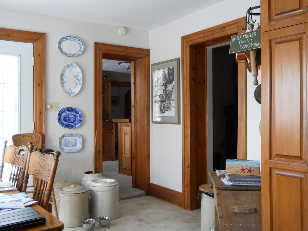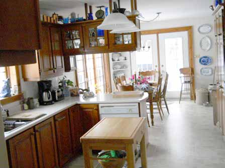 A fully-equipped, complete pine kitchen 12' x 11' adjoins a comfortable eating area 12'6" x 12' and exit to the back deck. The kitchen eating area is a warm, welcoming meeting place leading to the back deck. You and your guests will enjoy a full view of the flats and south marsh area, river and ponds of the estate. The table easily seats 8 people. |
